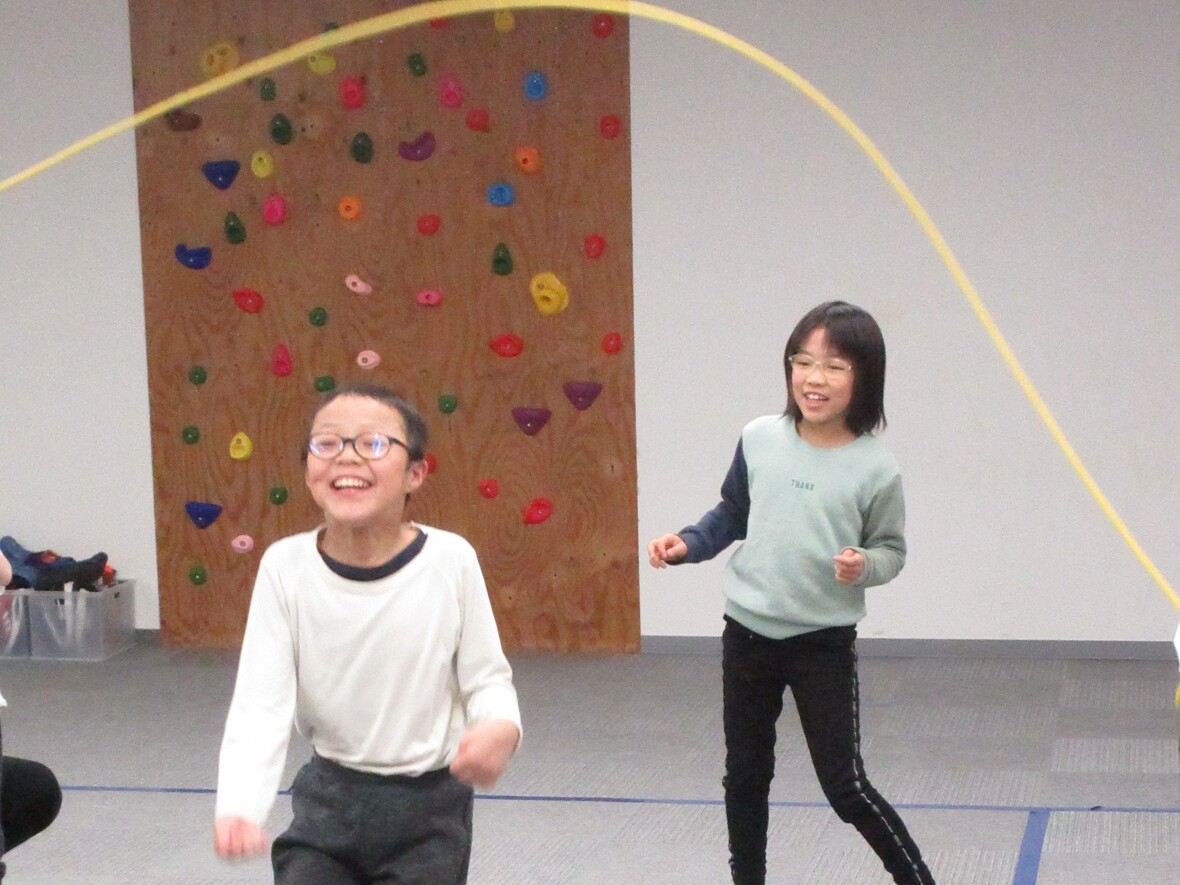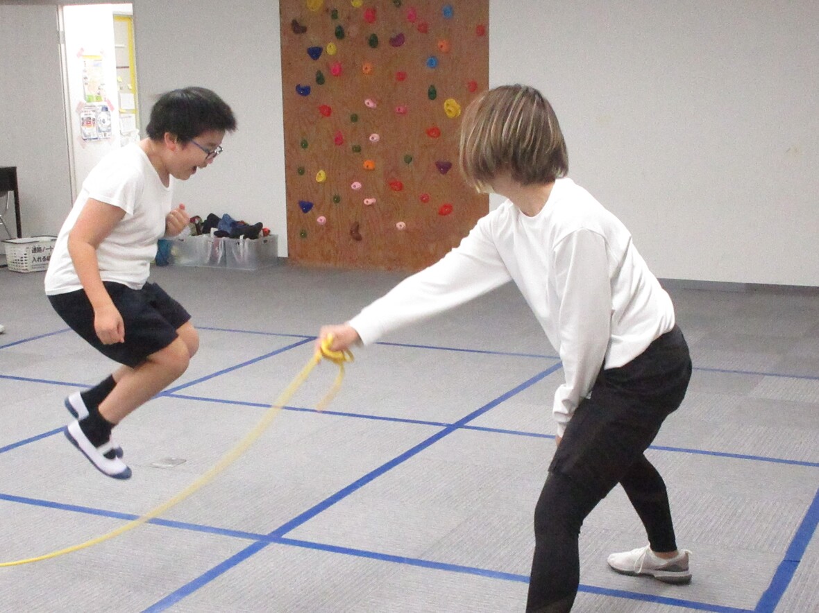 2023年12月07日(木) スタッフブログ ナツミ先生となわ跳びを楽しみました(フィットネスプログラム) なわ跳びは、ジャンプ力や全身持久力を高めるうえで効果的なプログラムです。また、ロープに引っかからないようにジャンプのタイミングをはかることは、コーディネーションの向上にも役立ちますね。もちろん、一人でも楽しめますが、長なわを使ってみんなで遊ぶと楽しさ倍増ですね!! 準備運動もしっかり行います 柔軟性バッチリ ジャンプの練習も行ってから 高~い!! いよいよ”なわ跳び” なわの動きをよく見てタイミングをはかります 上手に跳べました