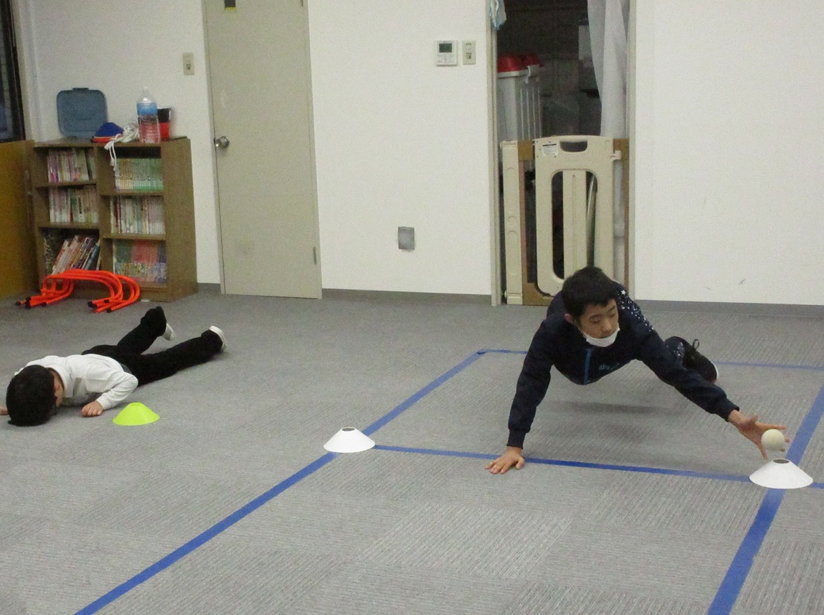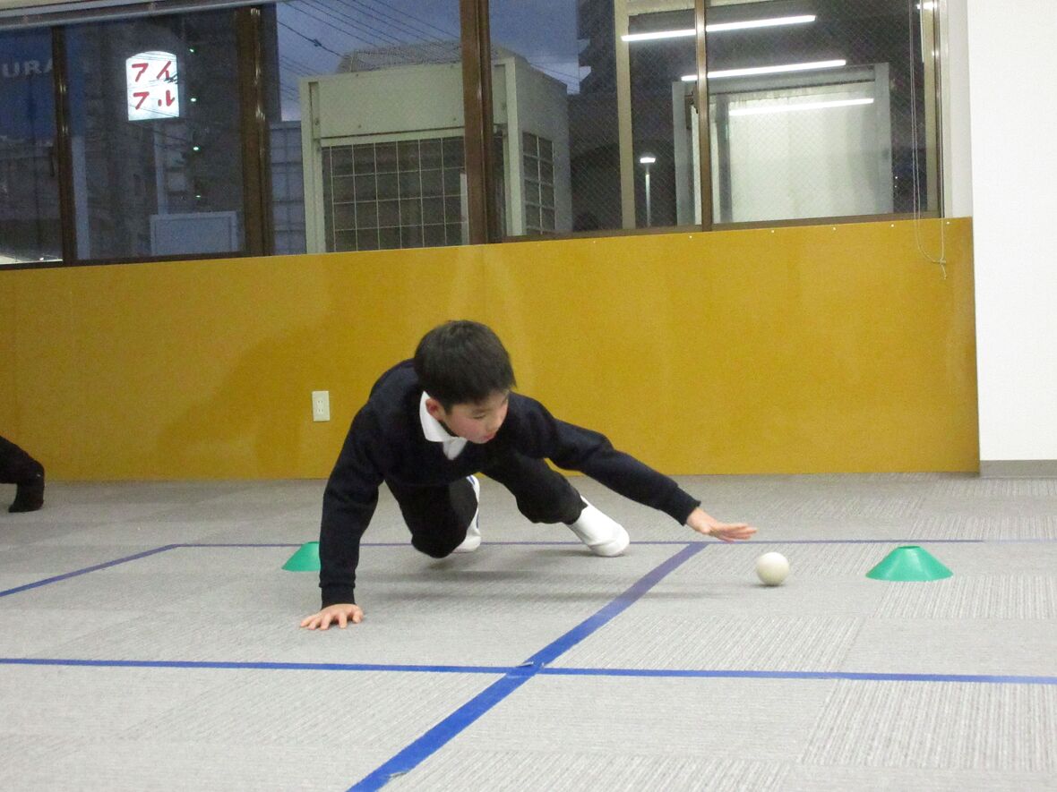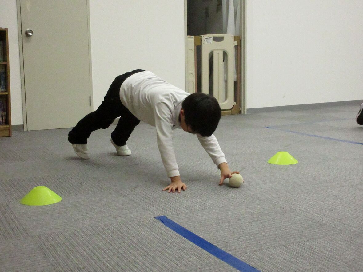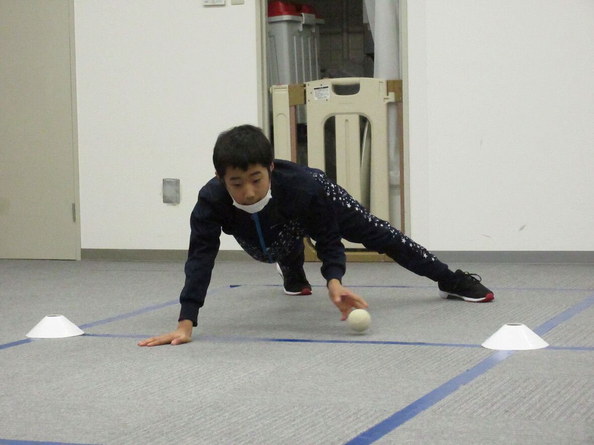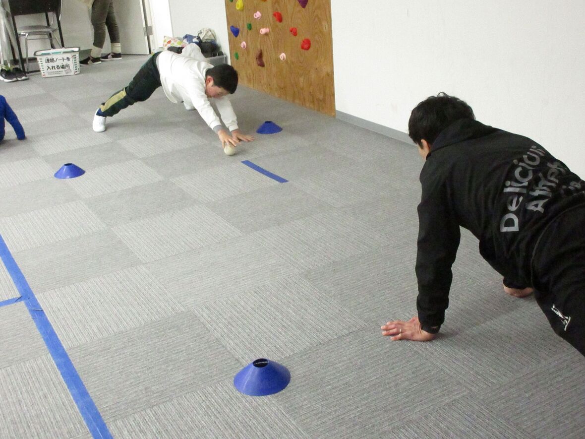 今日はタカ先生と体幹とジャンプのトレーニングを行いました。四つ這いは、体幹をトレーニングするうえで重要な姿勢です。その姿勢から発展して、転がってきたボールを手に取ることによって、両足と片手でバランスを保つために体幹がさらに使用されます。体幹トレーニングの後は左右の移動ジャンプもチャレンジしました。
