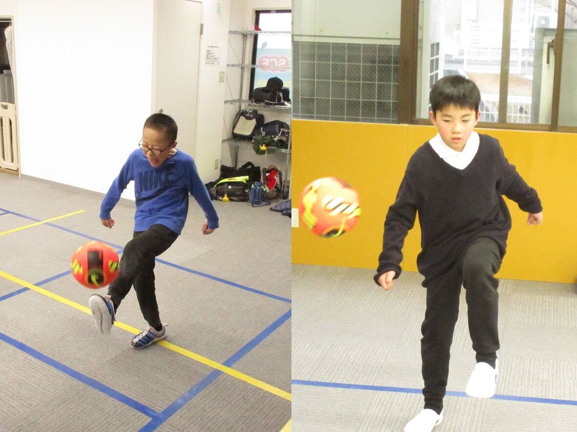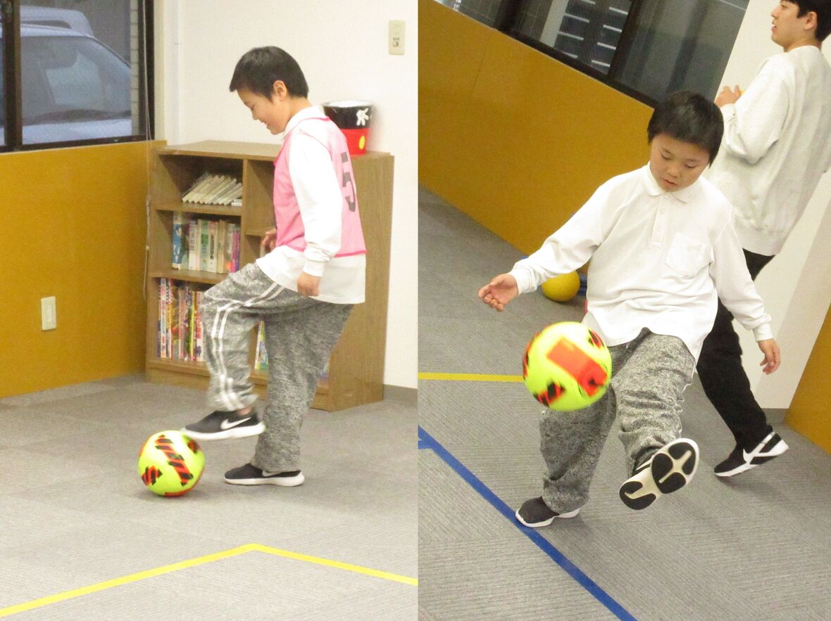 2024年01月29日(月) スタッフブログ サッカーのパスを練習しました(ビジョントレーニング) サッカーボールでは、強く遠くに蹴ることやコントロールされた正確なシュートやパスはもちろんですが、パスを受けた時にトラップによってボールを自分の近くに止めることもとても重要です。ゴロや高いバウンドのパスなどをお互いに出し合って、トラップの練習にチャレンジしました。 腰の高さのボールをトラップ!! 何度も繰り返し練習しました 上手にコントロールできていますね