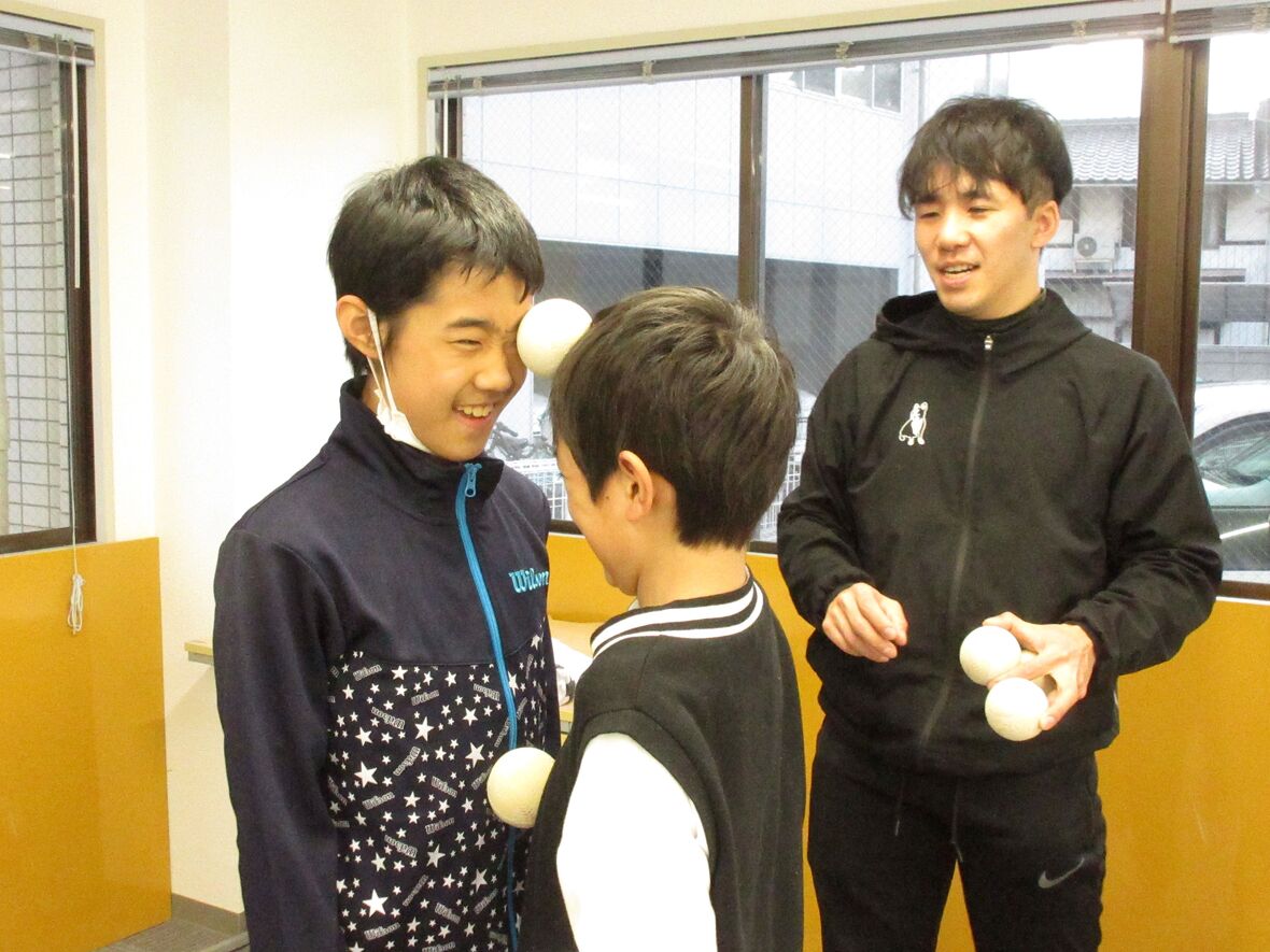 2024年02月06日(火) スタッフブログ タカ先生とコーディネーション! 今日はタカ先生とオニゴッコをしました。ウォーミングアップでは、野球用のソフトボールを二人で挟んだまま動かしていく課題にチャレンジ!相手とタイミングを合わせながら、力の加減をしていくことがポイントです。オニゴッコは「けんけんオニ」。足腰を鍛えて、体幹のトレーニングにも効果的です。 ボールを挟んで 頭の上まで移動できました 先生とチャレンジ けんけんオニのスタート! 先生は両足?