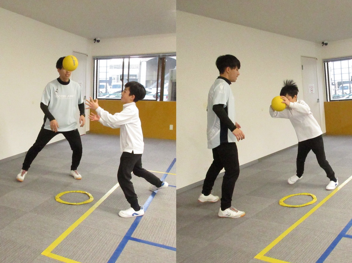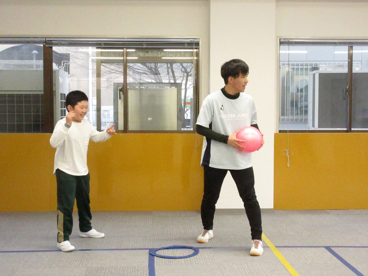 2024年02月13日(火) スタッフブログ タカ先生とボールを使った運動をしました!! 今日はタカ先生とボール運動の日です。ボールは投げたり、蹴ったりのみでなく、様々な活用方法があります。二人組になって、フープの中でバウンドさせてパスをする練習は、床にバウンドさせる力加減と方向が大切です。うまくいかなかった時には、視覚情報をもとに修正を行うことで、協応動作(目で見た情報と体の動きをリンクさせる)の正確性が高まっていきます。 パス練習からスタートして 今度は下からタップしながらボールをコントロール フラフープを用意したら・・・ ちょっと高度な、バウンドパスにチャレンジ