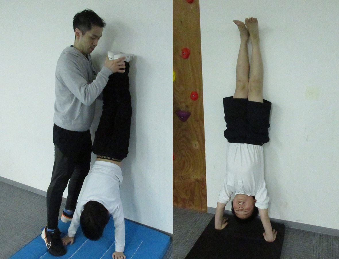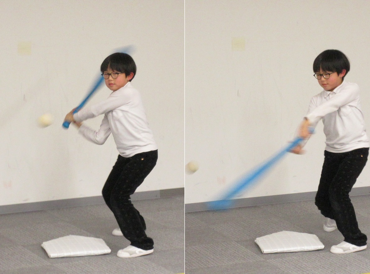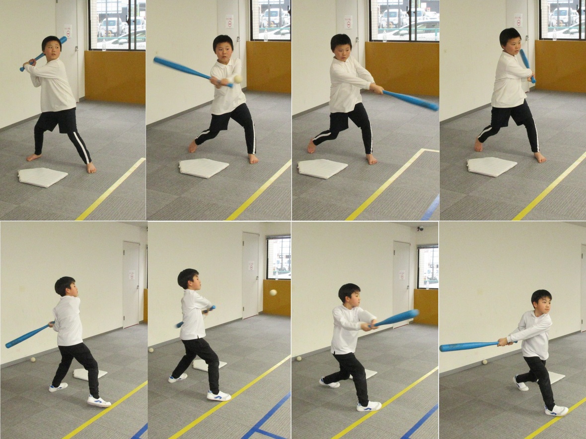 今日は連続写真でバッティングフォームを解析してみました。①ボールをよく見てテイクバック②ボールの動きを予測してスイング開始③インパクトの瞬間の力加減④フォロースルーの順序で自分の課題を探してみます。野球のスイングは、ボールの動きなど視覚情報の処理と、自分のイメージ通りに、腕をはじめ全身の筋肉を動かすために、高いコーディネーション能力を必要とする高度な動作です。また、フジイ先生のクラスで強化している壁倒立(壁を使った逆立ち)もしっかり習得できてきました。壁にお腹を向けて、足で少しずつ登っていくウォールウォークから、勢いをつけて、壁に背面を向けて行うキックアップも姿勢が良くなってきましたよ。