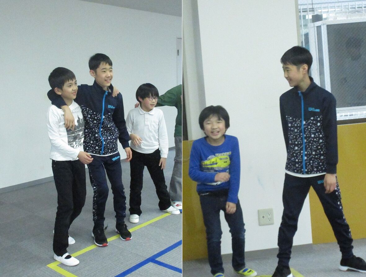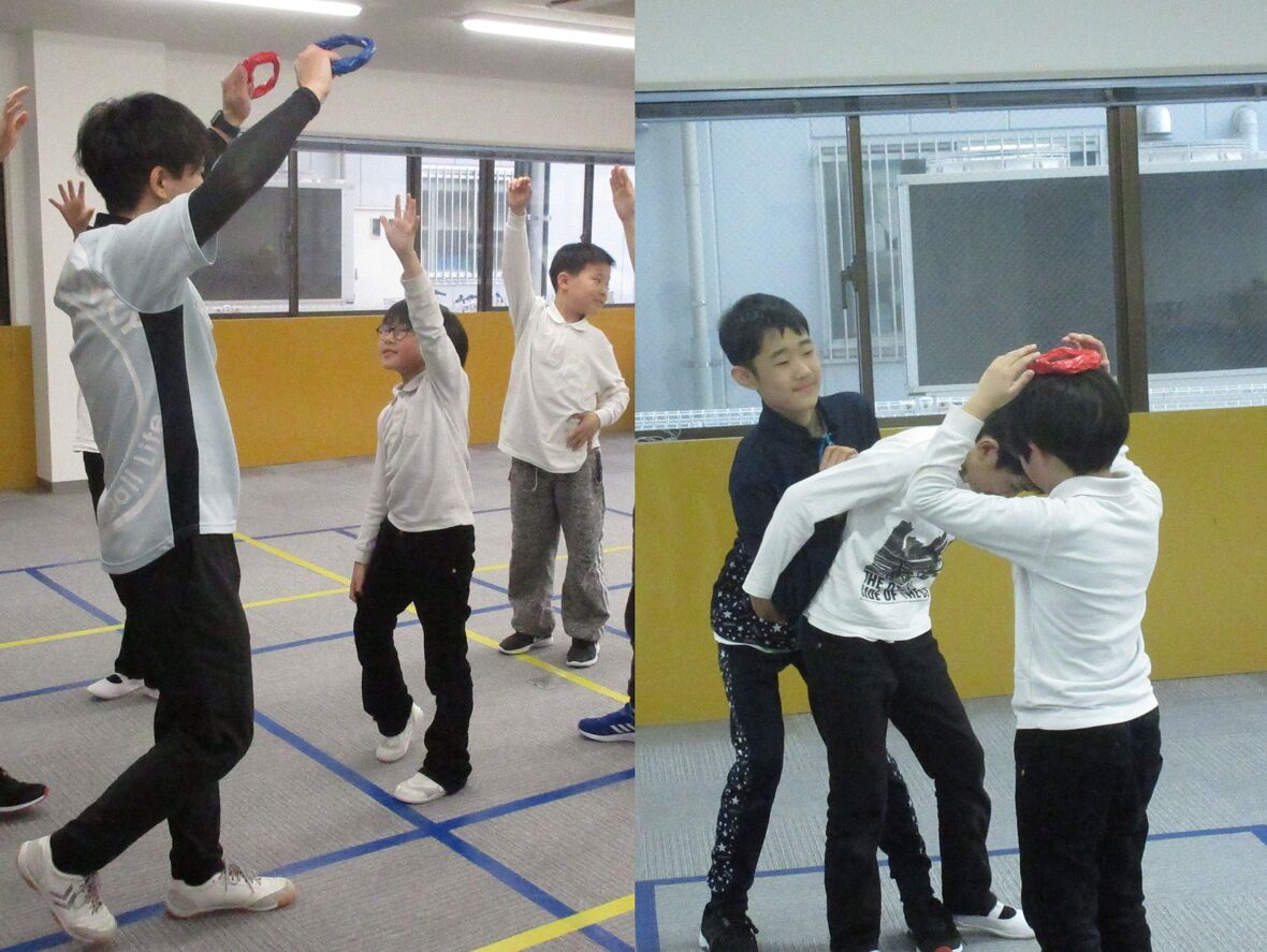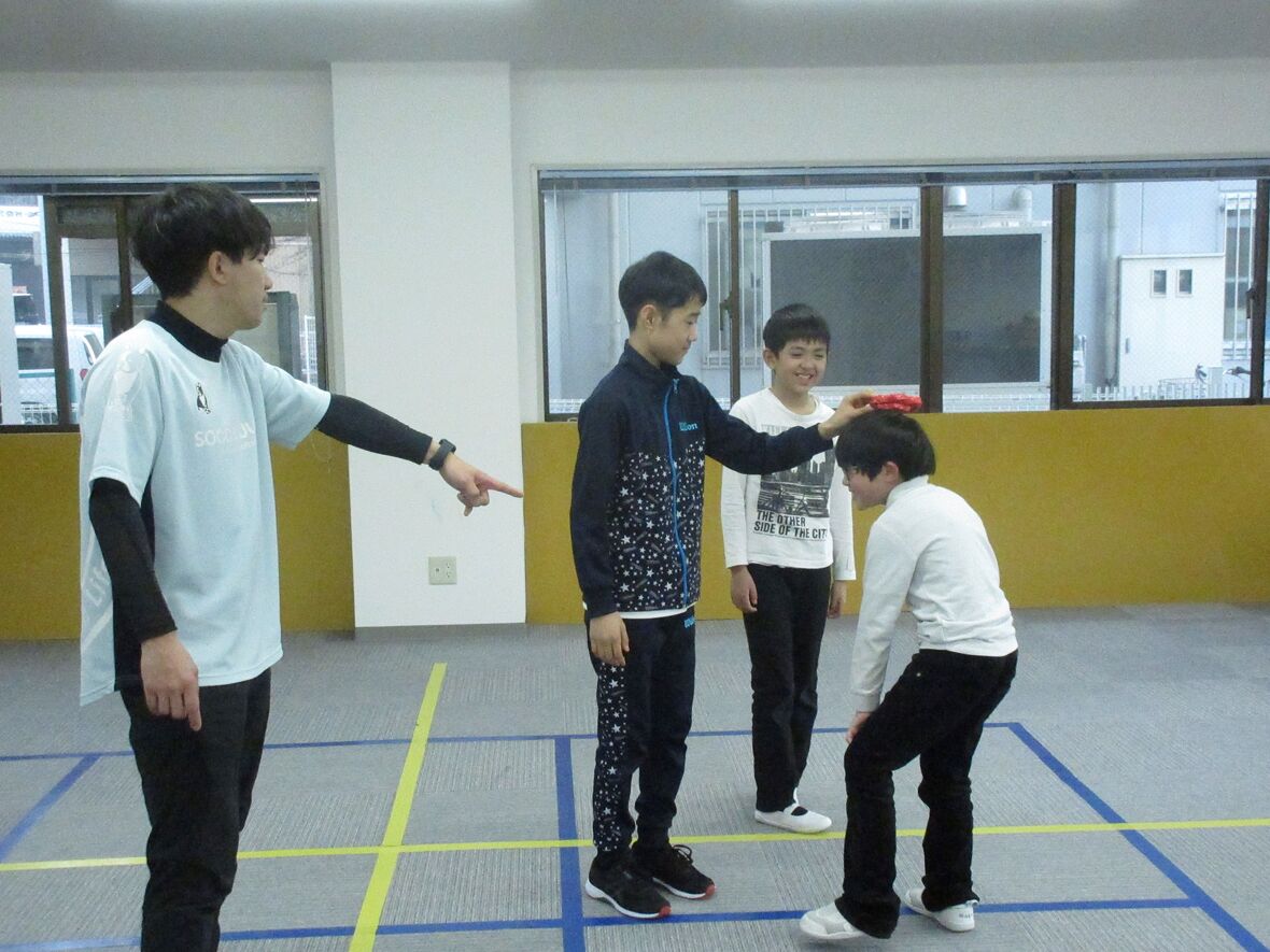 2024年02月27日(火) スタッフブログ タカ先生とおにごっこ!! タカ先生が考えてくれる遊びは、いつもいろいろな工夫がいっぱい!今日はリングを頭にのせて、"おにごっこ" 。リングが落ちないようにすることで、頭部の揺れを少なくしてよい姿勢が保持されます。 最初は2人組でおにごっこ! 今度はリングを頭にのせて・・・ 落とさないように慎重に