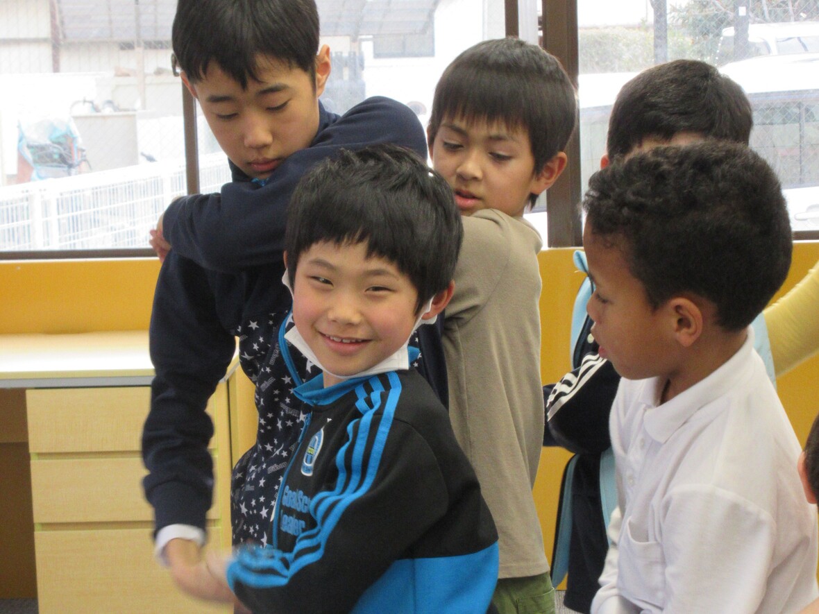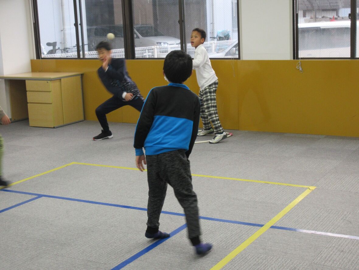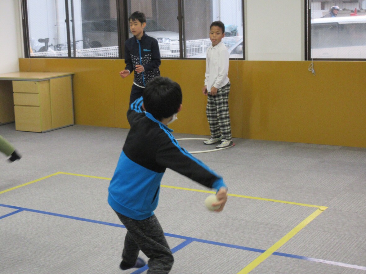今日は「人間知恵の輪」というゲームをやってみました。みんなで手をつないで、一つの輪になってから、手を離さないままで向きを変えたり、体をひねったりしてみます。みんなで意見を出し合って相談しながら課題を解決することが必要であり、このような課題解決のゲームをイニシアティブゲームと言います。課題をグループで協力しながら解決する活動を通して、お友だちとの意思疎通をはかり、協力する態度を養うことを目的としています。人間知恵の輪の後は、昔懐かしい「ろくむし」という遊びにチャレンジ!!相手チームが投げるボールに当たらないように、決められたコースを6回往復するゲームです。