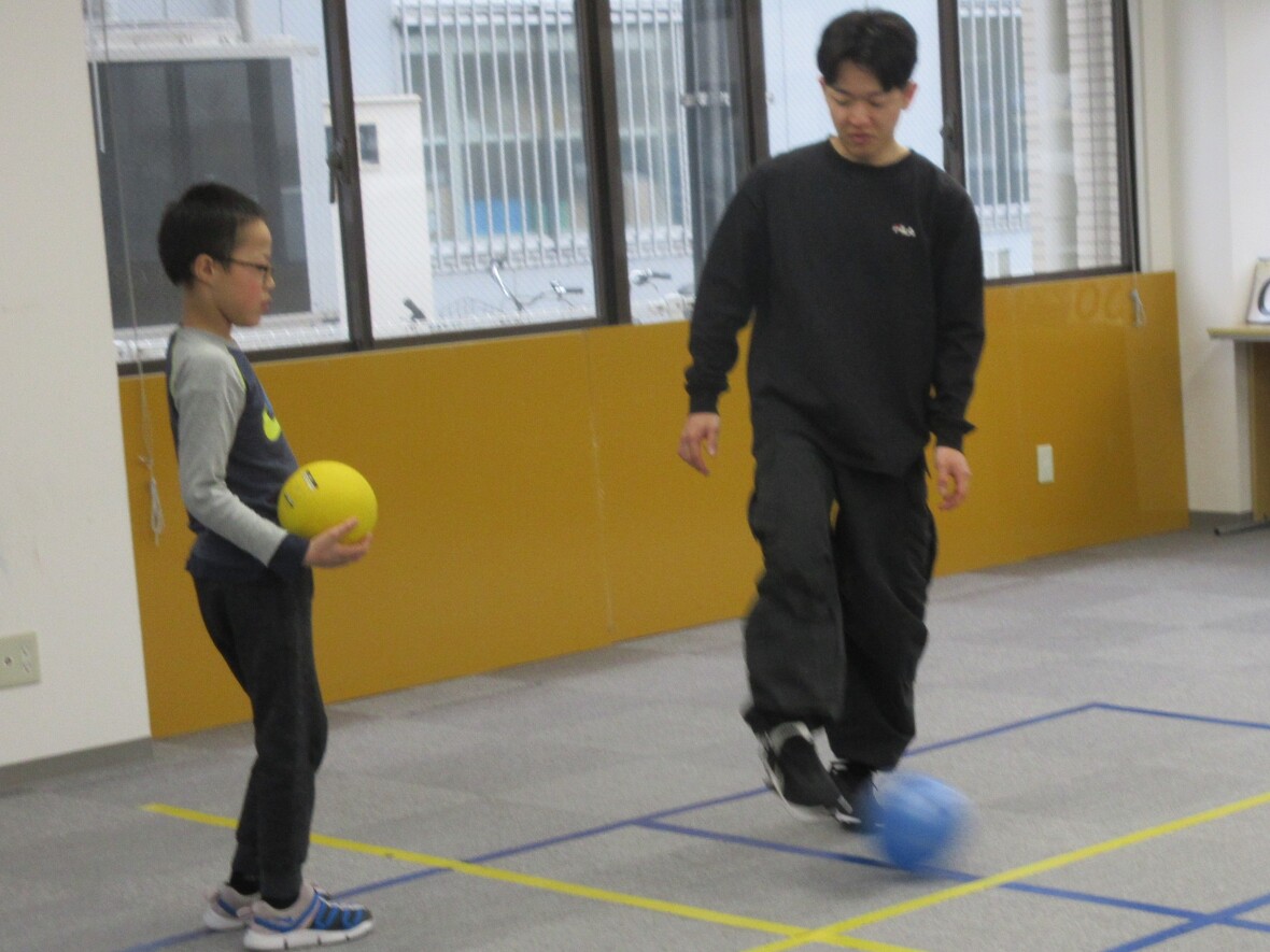 2024年03月11日(月) スタッフブログ ビジョントレーニング(サッカー) サッカーにおいて、味方へのパスの際には、スペースを見つけながら味方の動きを把握することが大切です。またドリブルについては自分(の足)とボールとの距離を把握しながら、相対する選手の動きを観察・予測することが必要です。いずれも広い視野が不可欠であり、子どもたちのビジョントレーニングには最適です。 パスの受け方を教わります 視野をしっかり広く保ちながらドリブルやパスの練習です