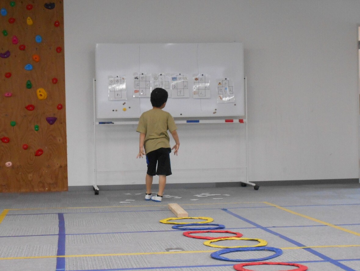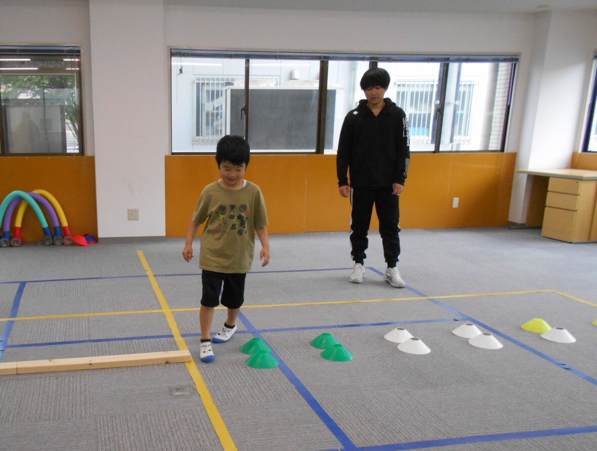 2024年05月06日(月) スタッフブログ 学習カードで頭とからだの体操 月曜日は学習カードの日!!!一本橋のバランスや、ジャンプをしてから、ホワイトボードのところに行って、貼ってある問題をよーく見て・・・答えのカードが探しに行きます。運動の刺激と、思考や記憶の刺激が効果的に結びつきます。さあ頑張ろう コーンでできたジグザグコースを走って おっとっと!一本橋 今日は言葉のパズル!できたかな?