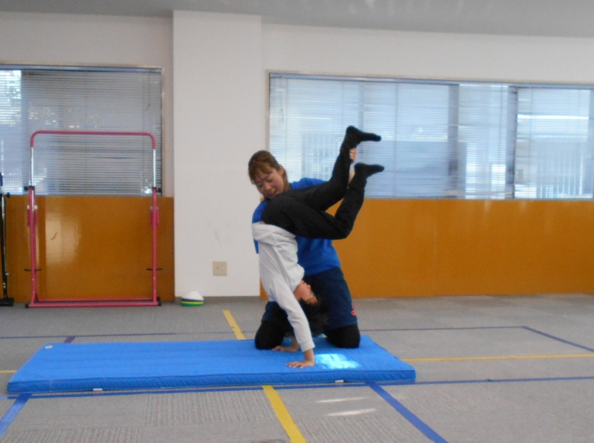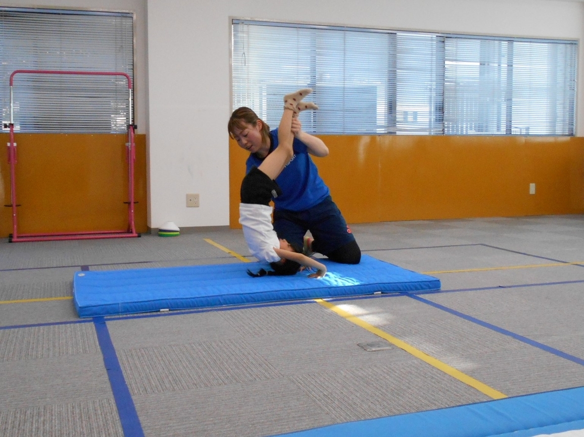 2024年05月10日(金) スタッフブログ ミポ先生と体操(今日は倒立前転!) 今日はミポ先生と体操の日です。今までのマット運動は前転や後転、そして側転を中心に練習してきましたが、今日は倒立前転という'技’にチャレンジしました。姿勢よく倒立ができていると、前転への連続がスムーズになります。最初は先生に補助をしてもらいながら頑張りました。 倒立を安定させてから 身体を丸めながら 前転につなげます。上手にできてますよ