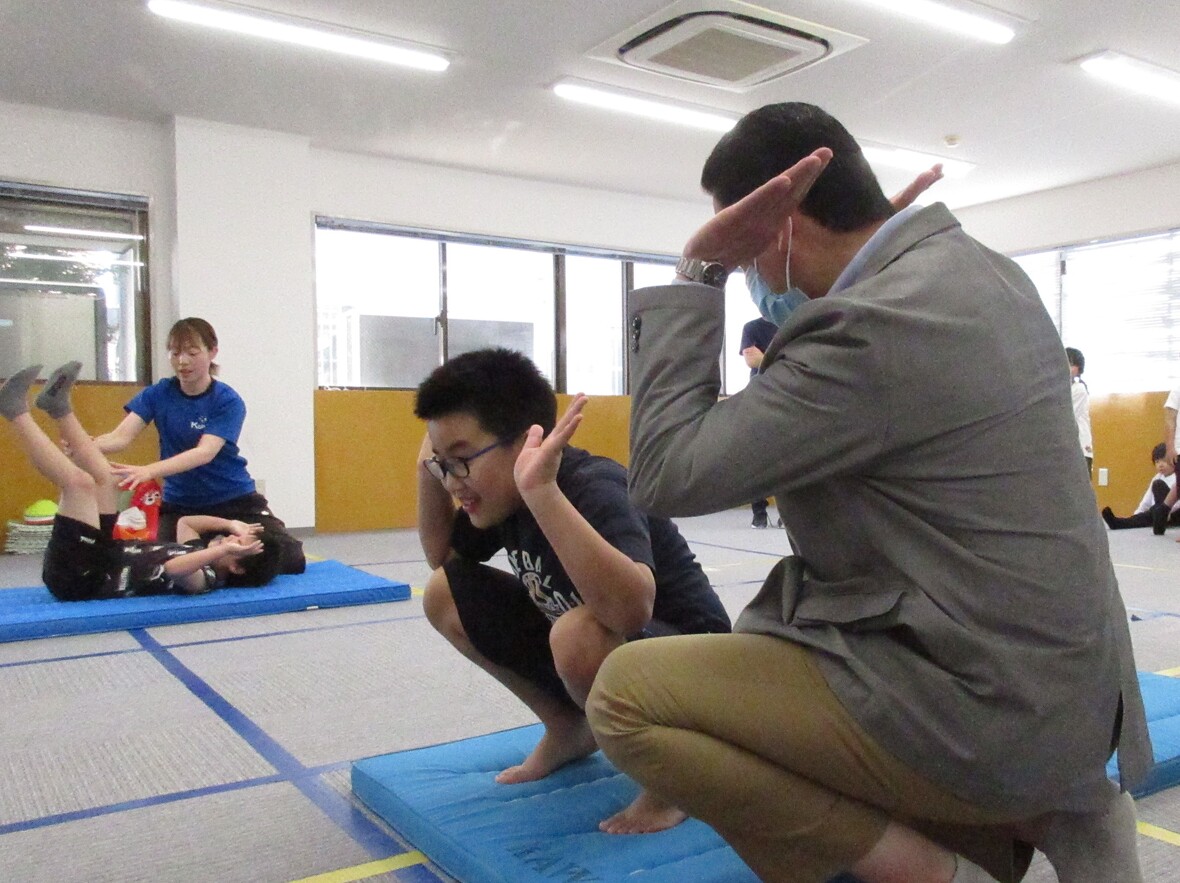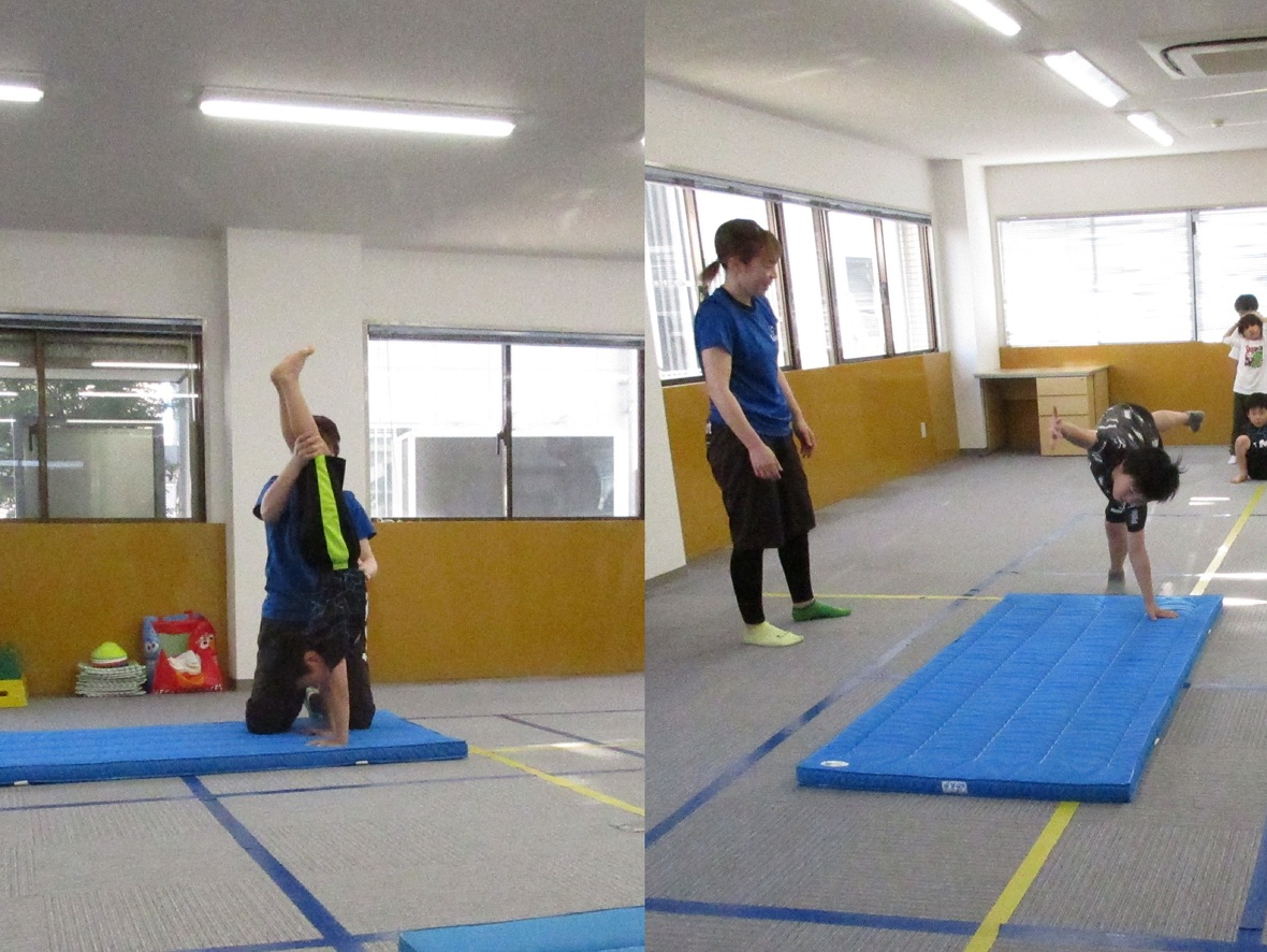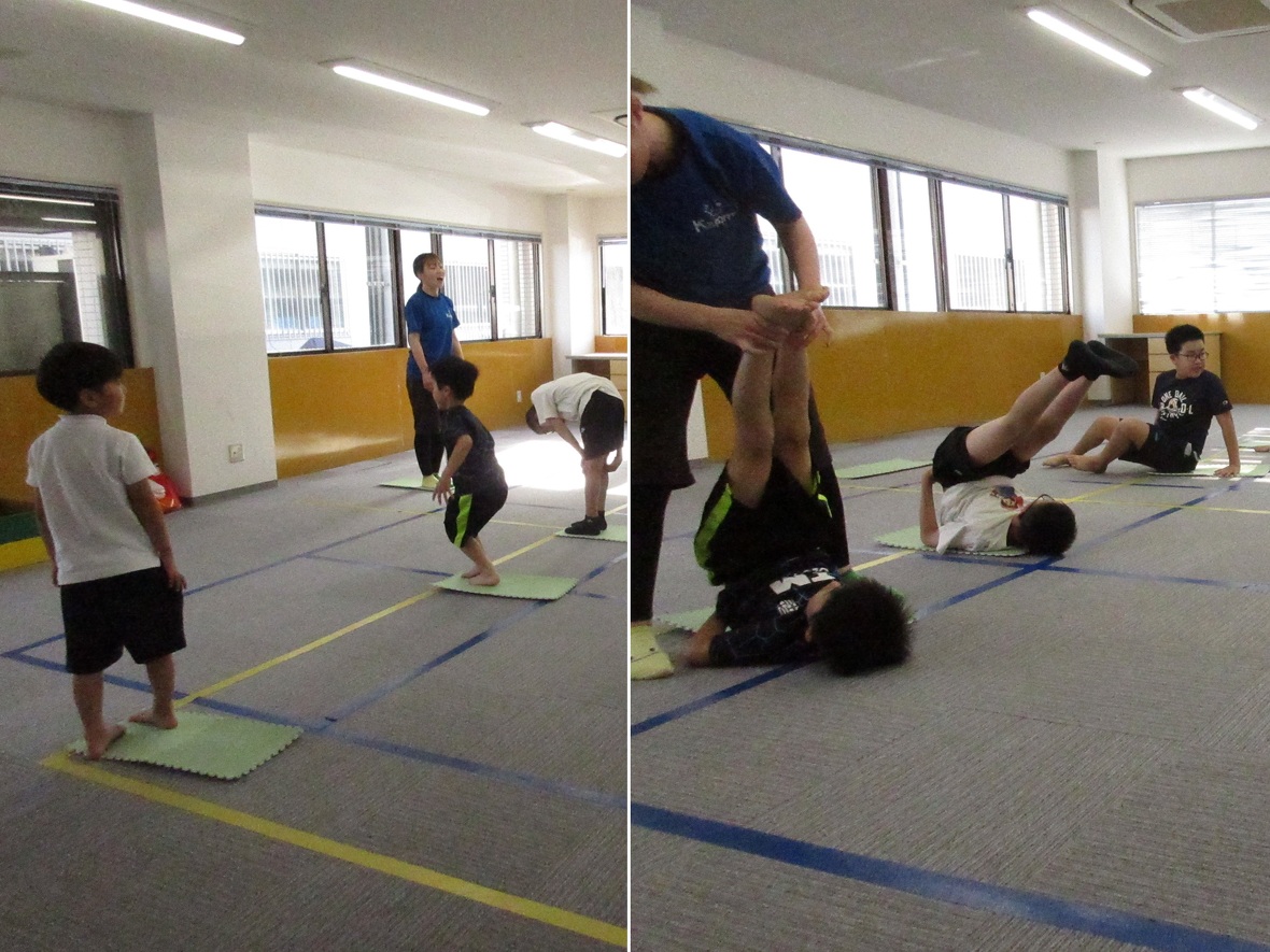 2024年05月17日(金) スタッフブログ ミポ先生とマット運動!! 今日はミポ先生と体操の日。元気な挨拶からプログラムがスタートしました!今日は倒立と後転がメインの種目。みんな一生懸命がんばりました 元気な挨拶と準備運動 倒立、側転。どちらも上手にできています。 後転のポイントは、耳の後ろで手を構えて、首を支えることです