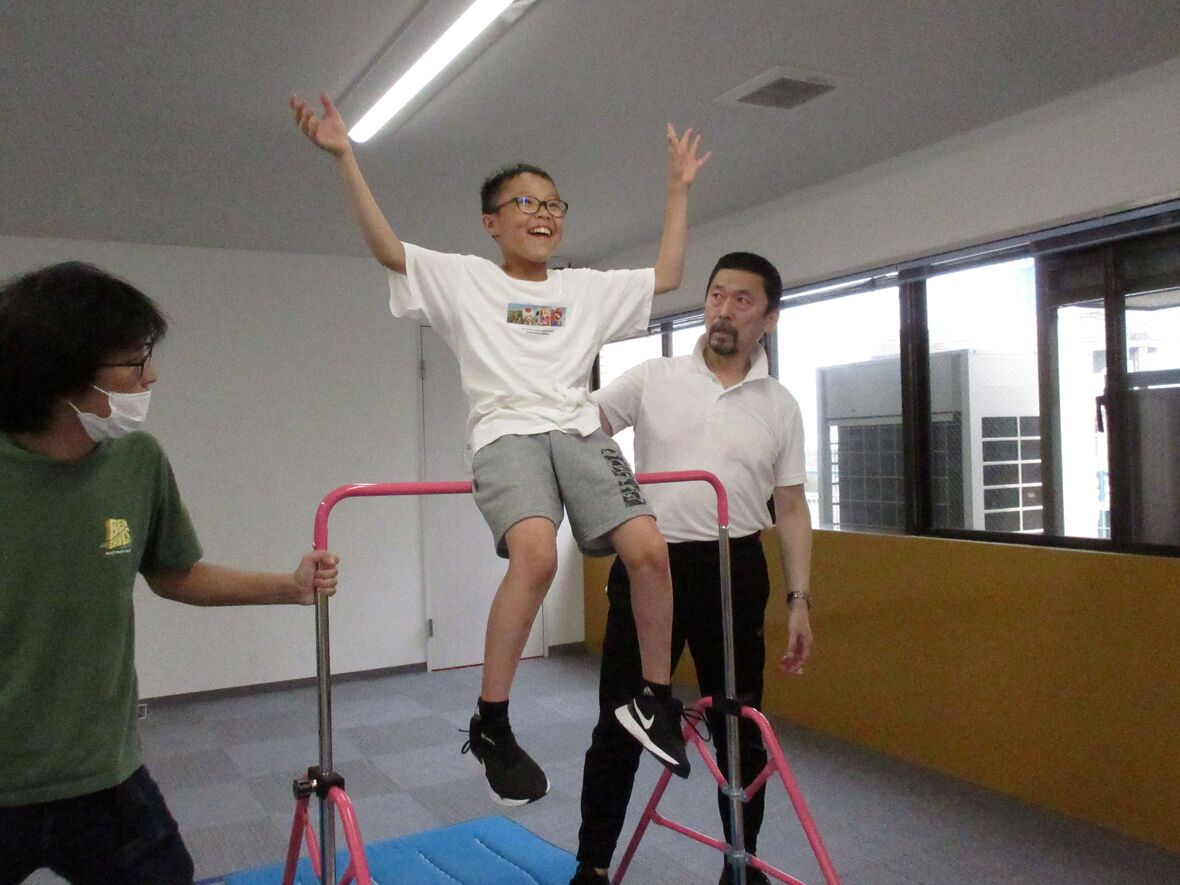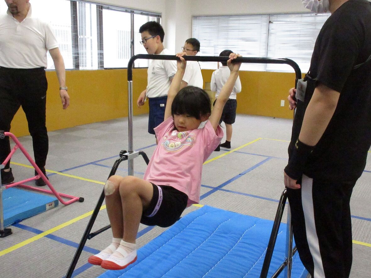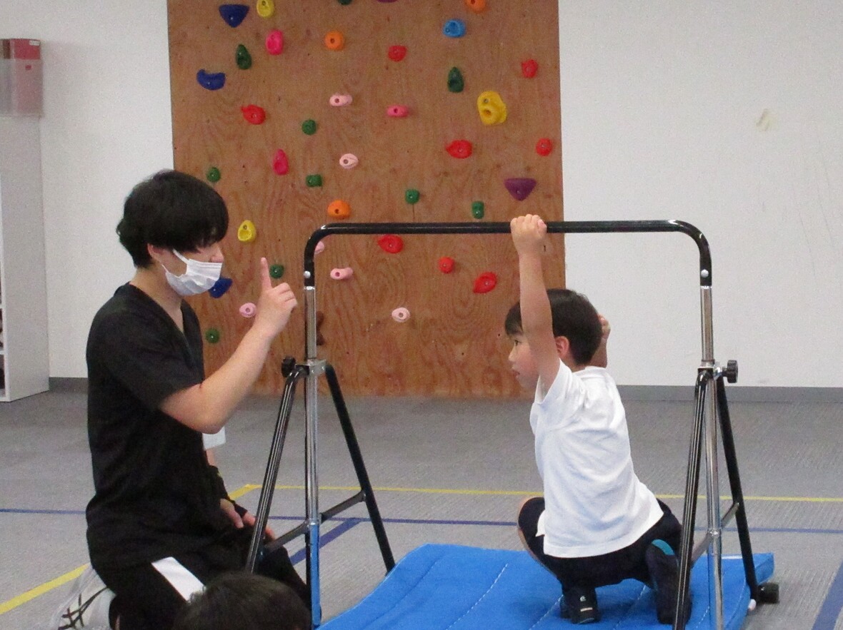 今日は体操の日。先月もチャレンジした「鉄棒に座る」練習をしました。バランスをとって不安定な鉄棒の上に座るためには、筋肉や関節で感じる力加減(専門的には固有受容覚といいます)と、主に三半規管で感知する体の傾きやスピード、回転の情報(同じく前庭覚)をうまく生かしながら、お尻の位置や、足の延ばし方などを微妙にコントロールすることが必要です。