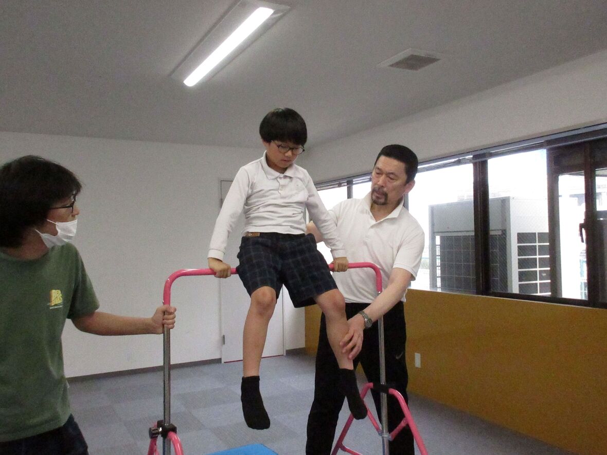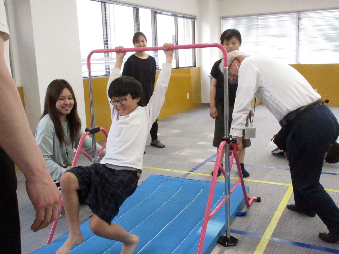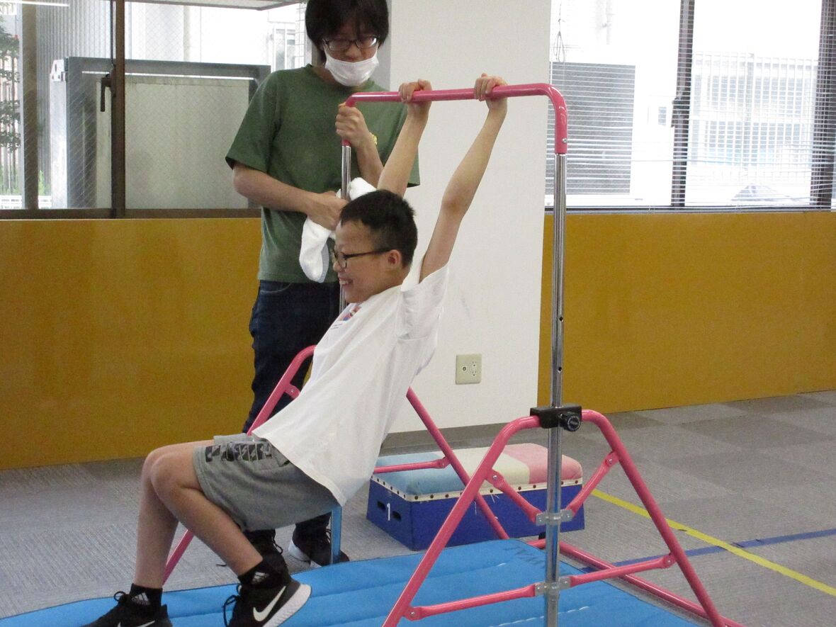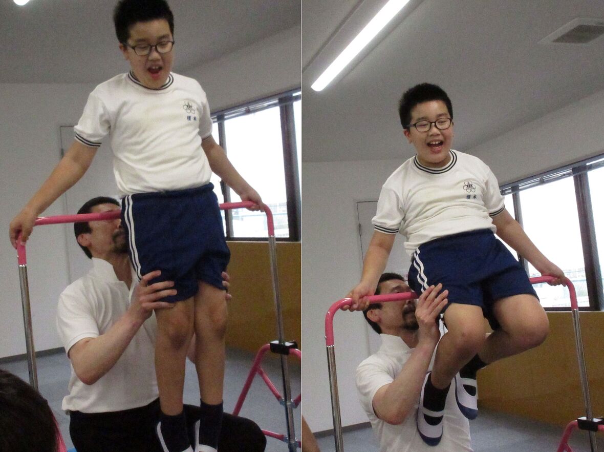 今日は体操の日。先月もチャレンジした「鉄棒に座る」練習をしました。バランスをとって不安定な鉄棒の上に座るためには、筋肉や関節で感じる力加減(専門的には固有受容覚といいます)と、主に三半規管で感知する体の傾きやスピード、回転の情報(同じく前庭覚)をうまく生かしながら、お尻の位置や、足の延ばし方などを微妙にコントロールすることが必要です。