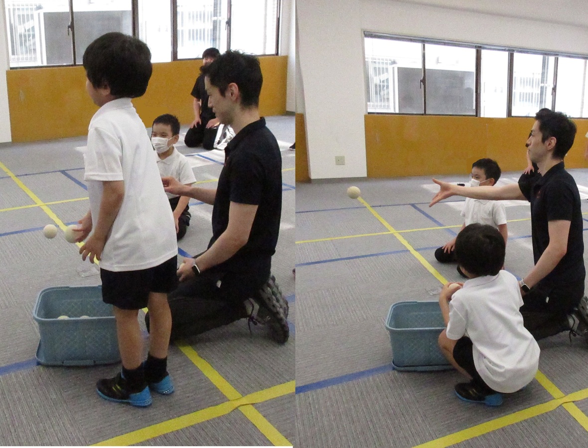 2024年06月12日(水) スタッフブログ フジイ先生と運動遊び(野球) 今日は野球のバッティング練習をしました。フジイ先生が打ちやすいコースにトスしてくれるので、ボールをよく見て力強くバットを振ってみます。いい当たりがたくさんあったので、みんな将来は野球選手・・・?野球の後は、宝物集めゲームを楽しみました。 先生がボールをトス。ボール集めはお友だちが手伝ってくれました カキーン!カキーン!ナイスバッティング コートの真ん中にある宝物(マーカーコーンですが)を自分の陣地に・・・ 他のお友だちの集めた宝物を持っていくこともできます 急げ急げ~ 3枚集まったら、チャンピオン♬