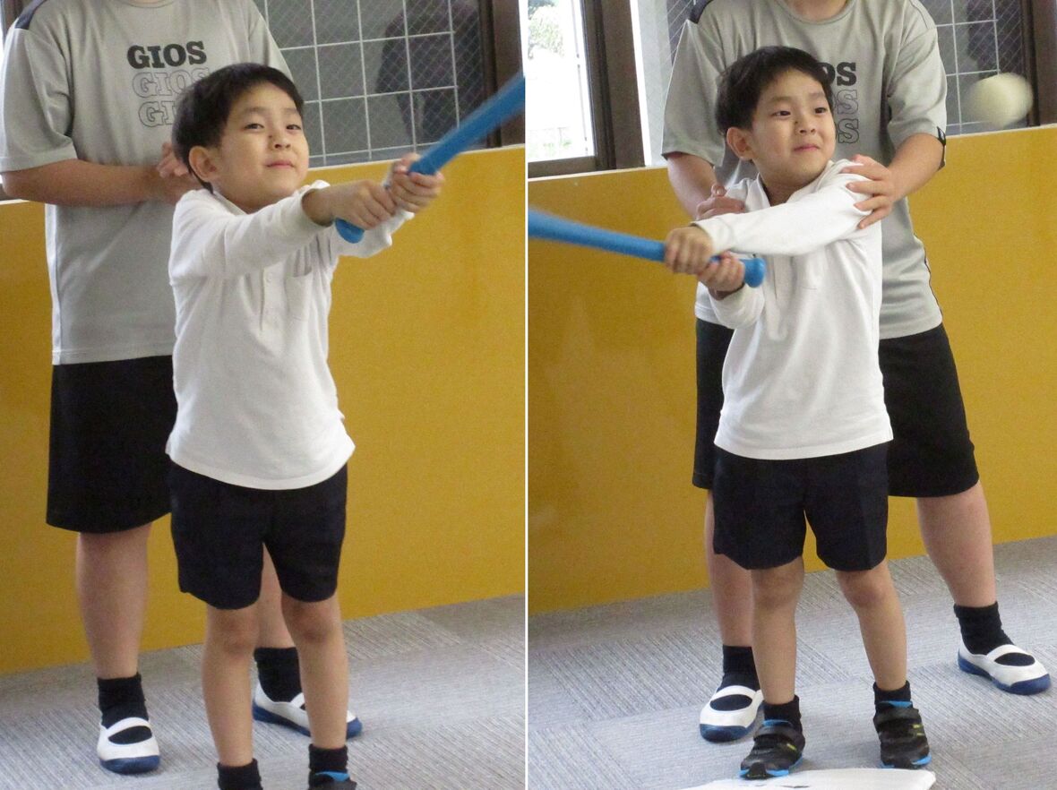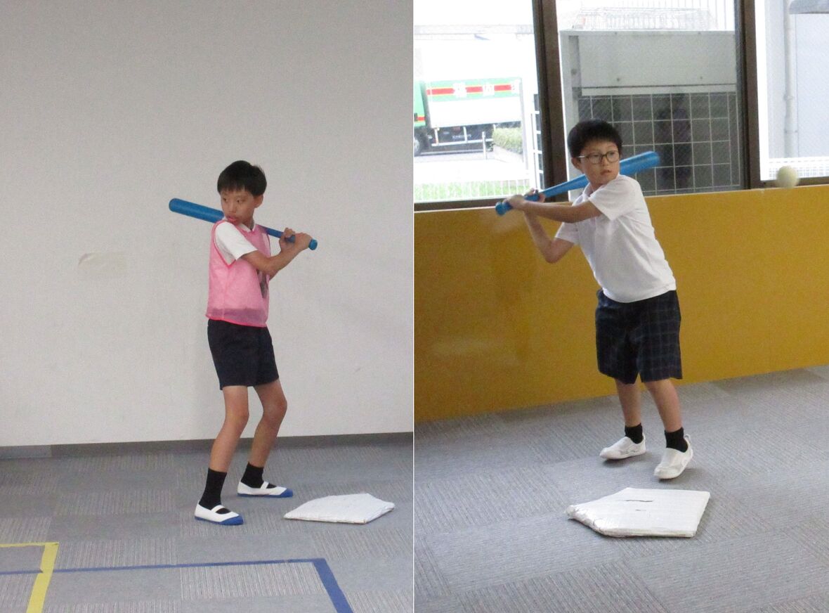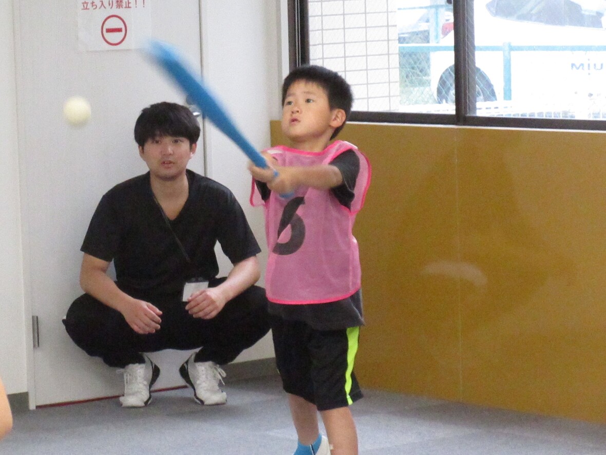2024年07月10日(水) スタッフブログ 野球はバッティングが基本です! 野球は、様々な関節の動きを組み合わせた、打つ動作、走る動作、そして投げる動作などを行うことができます。またボールの動きをしっかり見て、視覚情報をもとに、体を動かす神経協応能を高めることにも適していますね。 二人とも強打者の風格が・・・ やさ~しくボールを投げたその先には? 上級生にタイミングを教えてもらいながらスイング! 投げるのも、もちろん大切 1年生も頑張っています