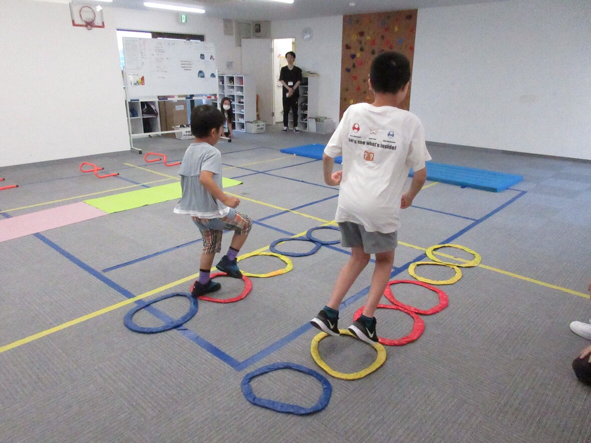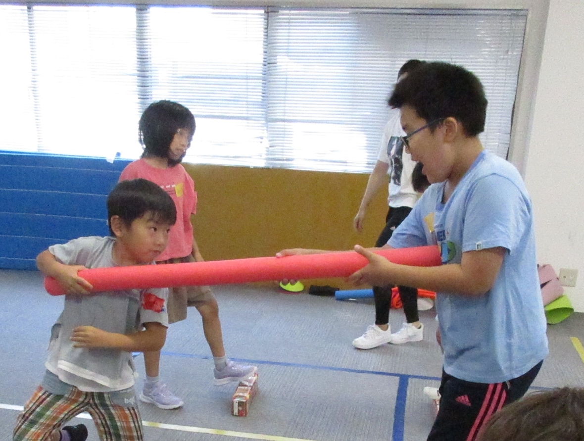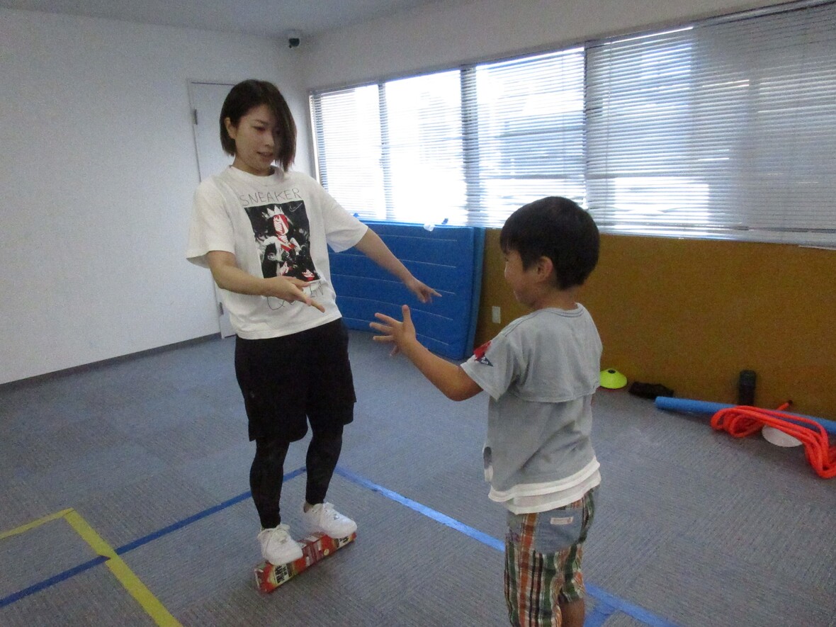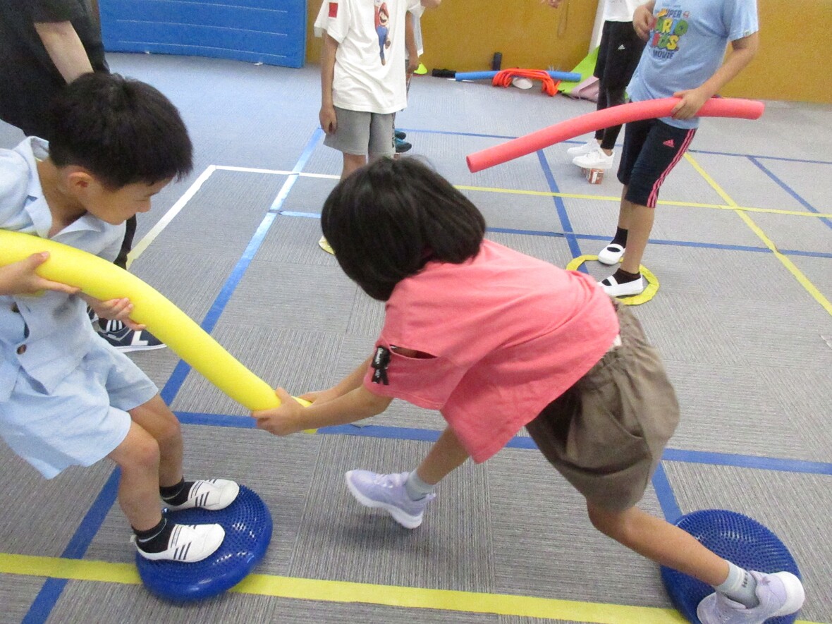 2024年08月01日(木) スタッフブログ ナツミ先生と体幹トレーニング! 体幹は、姿勢の維持や様々な動作の土台や軸として使われます。大人には体幹部を集中的にトレーニングする方法をおすすめすることが多いのですが、子どもたちの場合は、遊びや好きなスポーツを行いながら、自然と強くなっていくことが理想ですね。 しっかり準備運動しましょう 柔軟性もバッチリ ジャンプも体幹トレーニングには最適です 決められた位置に立って、お互いにウレタンポールを持って相手のバランスをくずすゲーム。 こちらは同じゲームをバランスディスクの上で行っています(体幹をしっかり使います) 不安定な台の上で、ジャンケンポン!