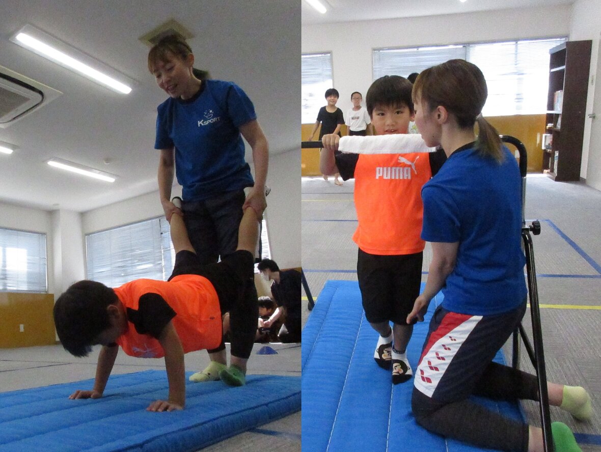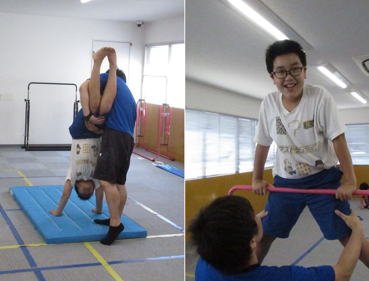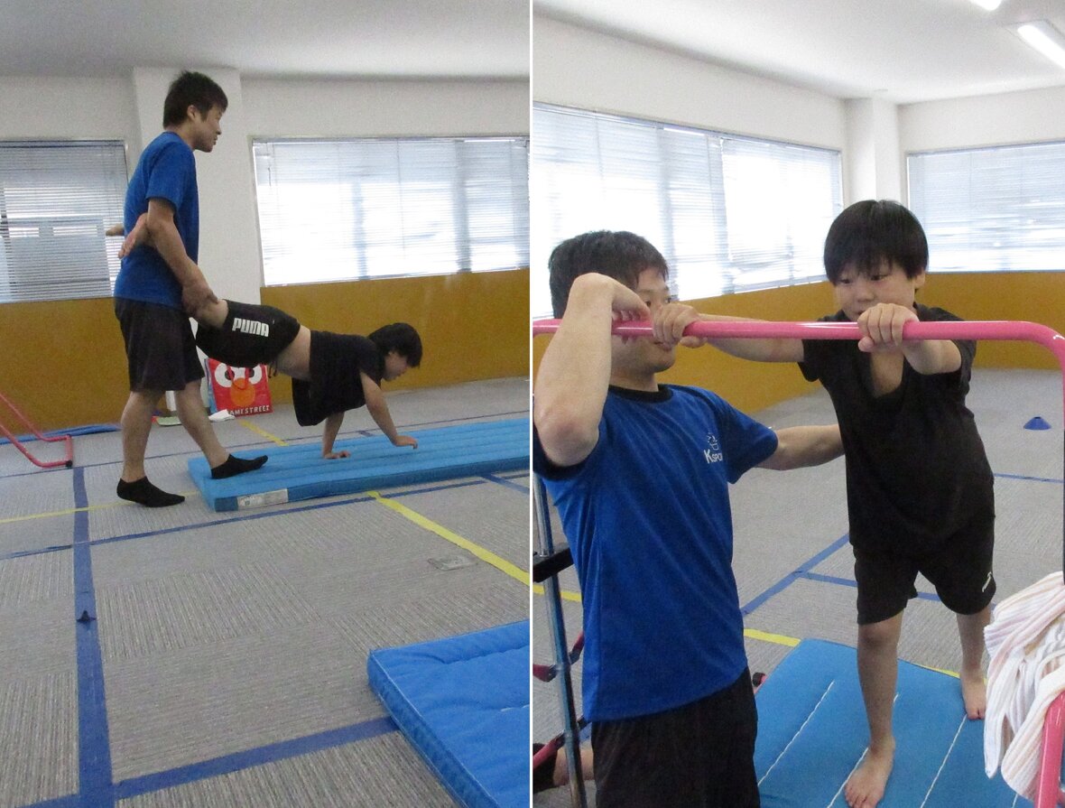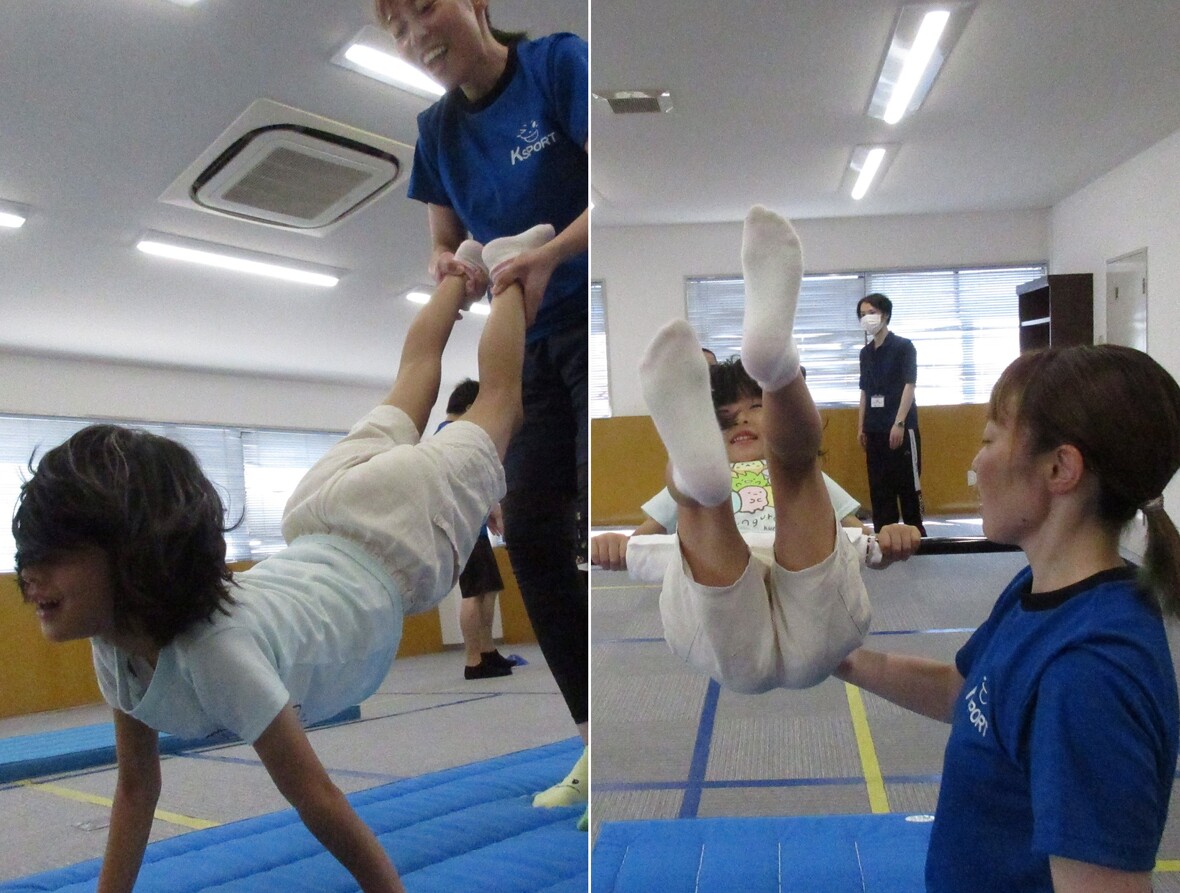 2024年08月02日(金) スタッフブログ マット運動と鉄棒にチャレンジ!!! 金曜日は、ミポ先生と体操!今日は先週に引き続き、ケイスケ先生も来てくれました。今日は腕で自分の体を支える練習。手押し車で腕の筋力を鍛えると、マット運動や鉄棒を行う際の体の支持(腕で支えること)が安定します。 マット運動の後転も腕の支えが大切です 手押し車でしっかり腕で支える感覚をつかんでから、いよいよ鉄棒 こちらも頑張っています 腕でしっかり支持したツバメの姿勢から後方支持回転(いわゆる後ろ回り) 逆立ちも、鉄棒もしっかり腕で支えていますね