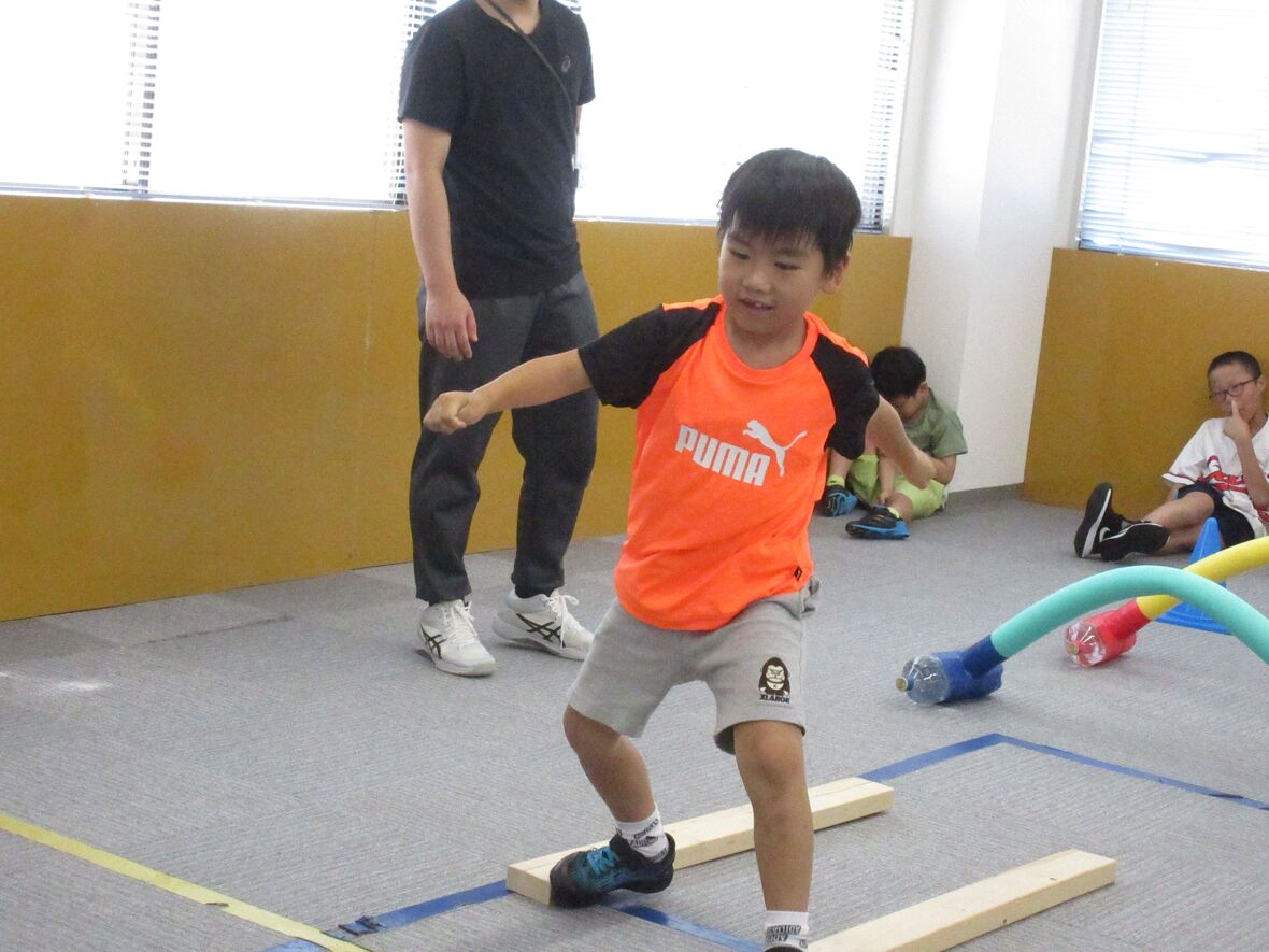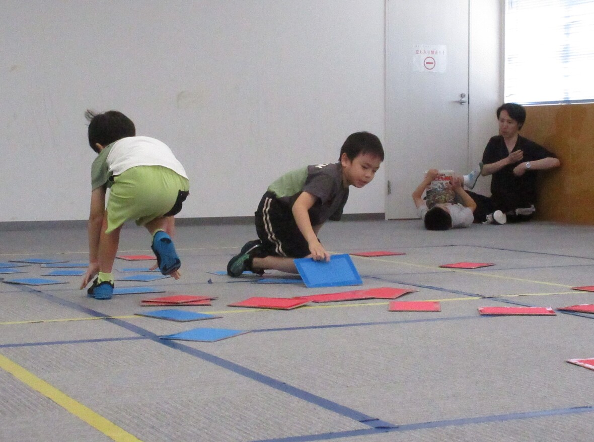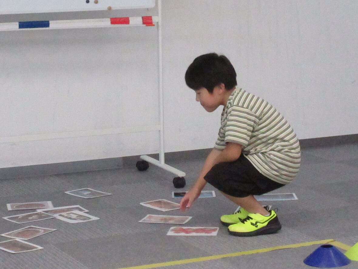 2024年08月05日(月) スタッフブログ 学習カードプログラムでしっかりお勉強! 毎週月曜日は学習カードプログラム。サーキット運動とカード学習の組み合わせです。動物や食べ物の写真と数字や文字をマッチングします。体を動かしてからお勉強をすると、より集中することができるようですよ! ミニハードルを上手に跳び越えて カードを探して・・・ 答えを考えます え~っと? 平均台のバランスも頑張っています スポーツ園名物”オセロ”いわゆるカードめくりゲームも楽しみました!